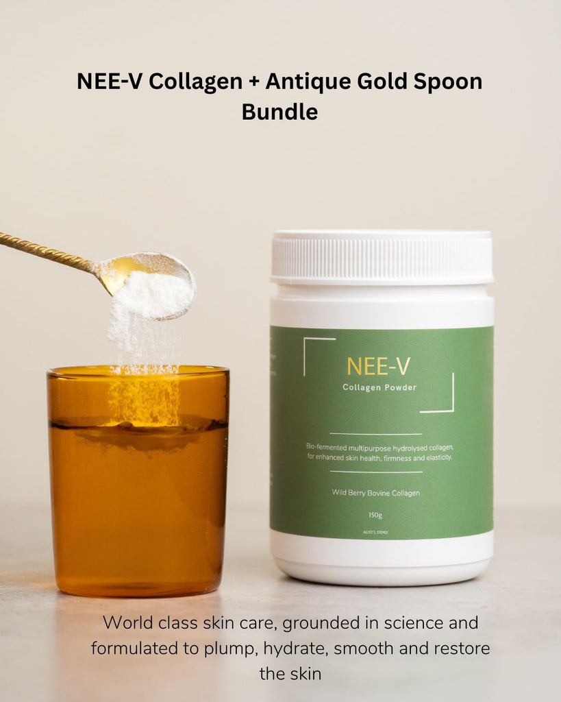 This bundle brings together two quiet essentials designed to support your collagen routine with intention and ease — NEE-V Collagen and our Antique Gold Spoon, chosen to elevate an everyday habit.