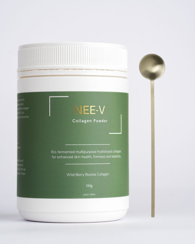 NEE-V Collagen is formulated to be taken daily, dissolving easily into water, coffee or smoothies as part of a consistent wellbeing routine. The antique gold spoon complements this ritual — minimal, timeless, and designed to slow the moment down as you measure, stir and return to care.
