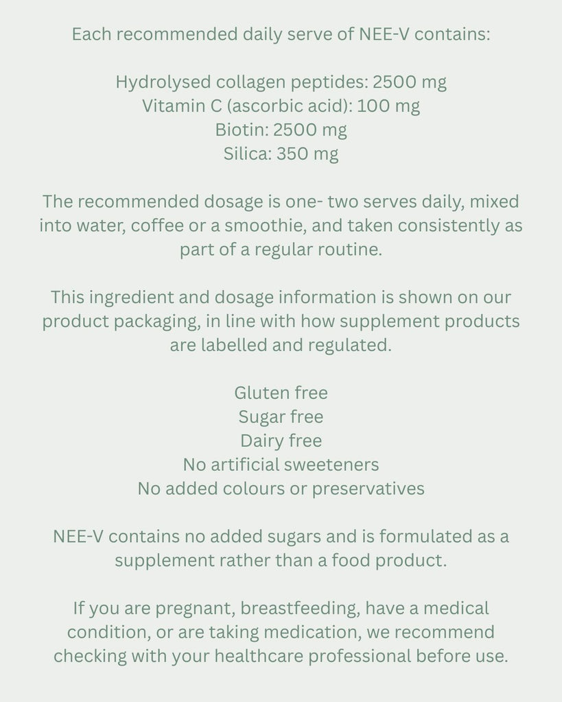 Formulated to support skin, hair, connective tissue and overall wellbeing, NEE-V combines hydrolysed bovine collagen with key supporting nutrients to assist collagen formation and daily nourishment.
